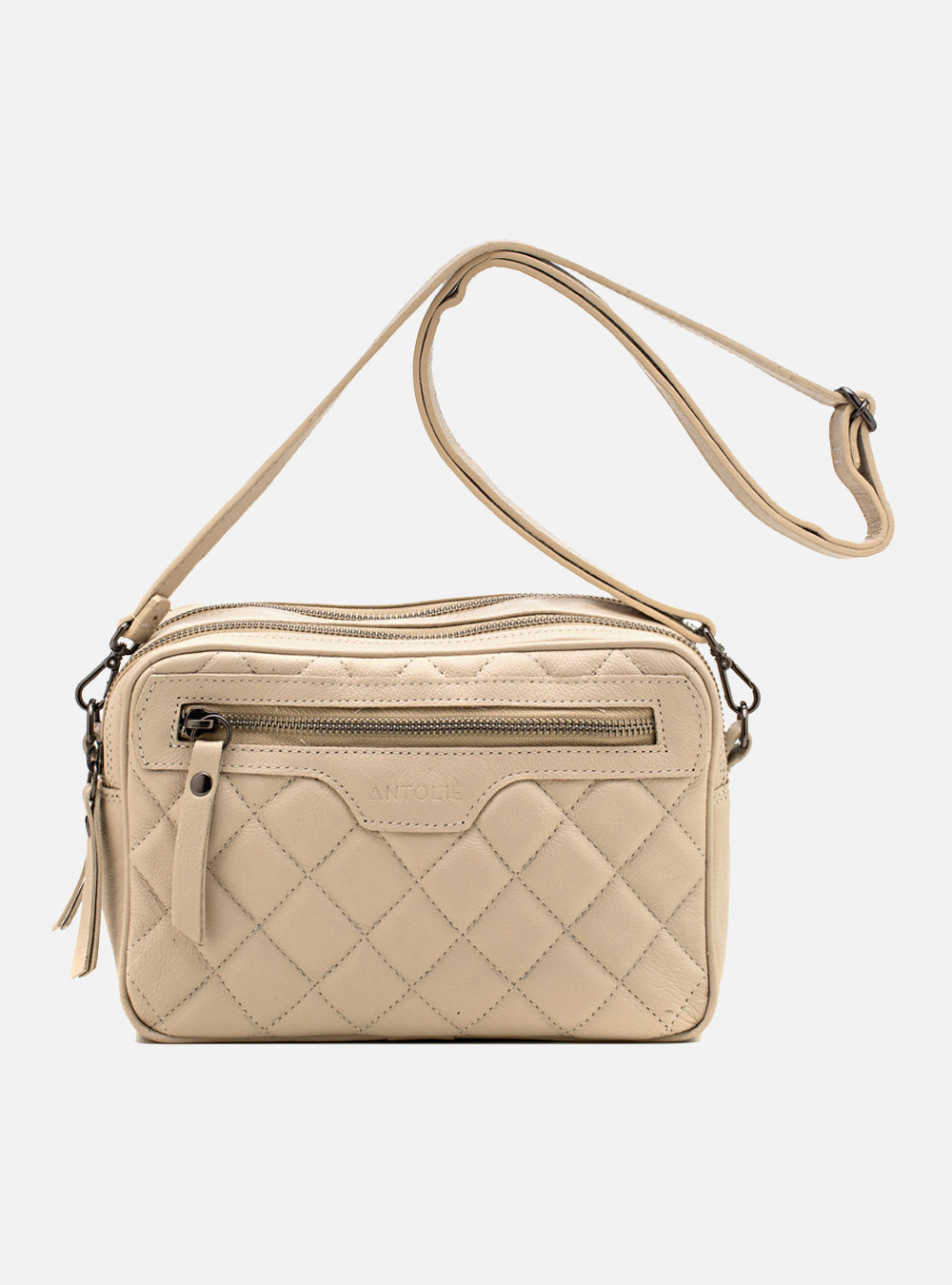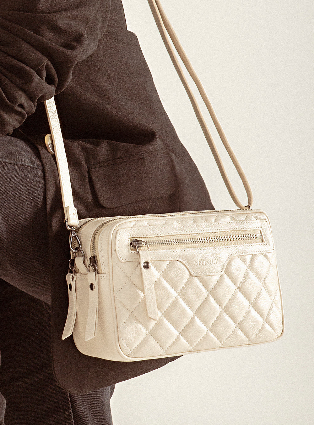 O couro matelassê em tom off white confere à bolsa uma textura suave e um visual elegante. Cada detalhe do matelassê ressalta o cuidado artesanal dedicado à peça, proporcionando não apenas beleza, mas também durabilidade excepcional.