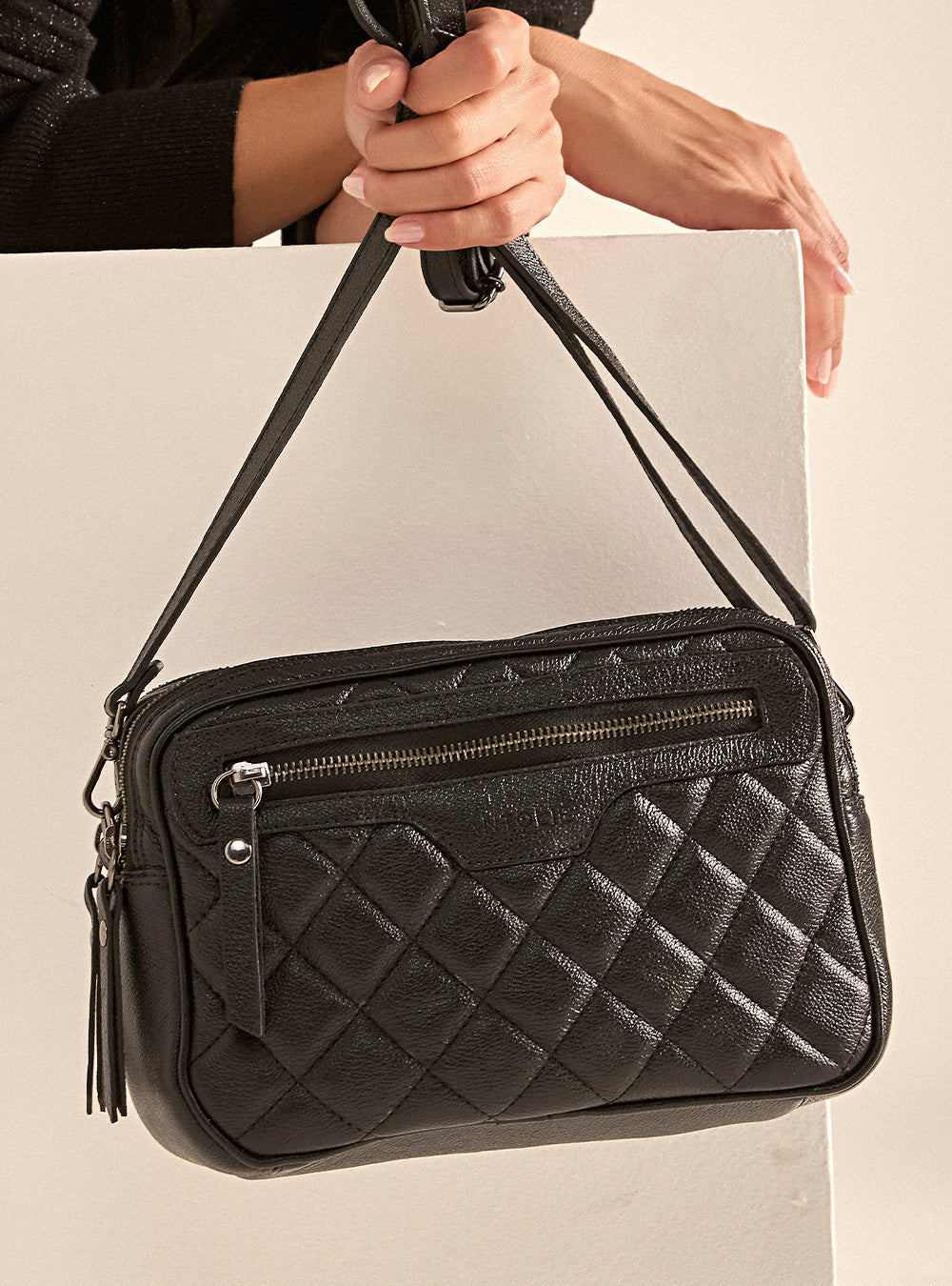 O couro matelassê em tom preto confere à bolsa uma textura única e um visual refinado. Cada detalhe do matelassê revela um cuidado artesanal que valoriza a estética e a durabilidade da peça, proporcionando uma experiência tátil luxuosa a cada toque.