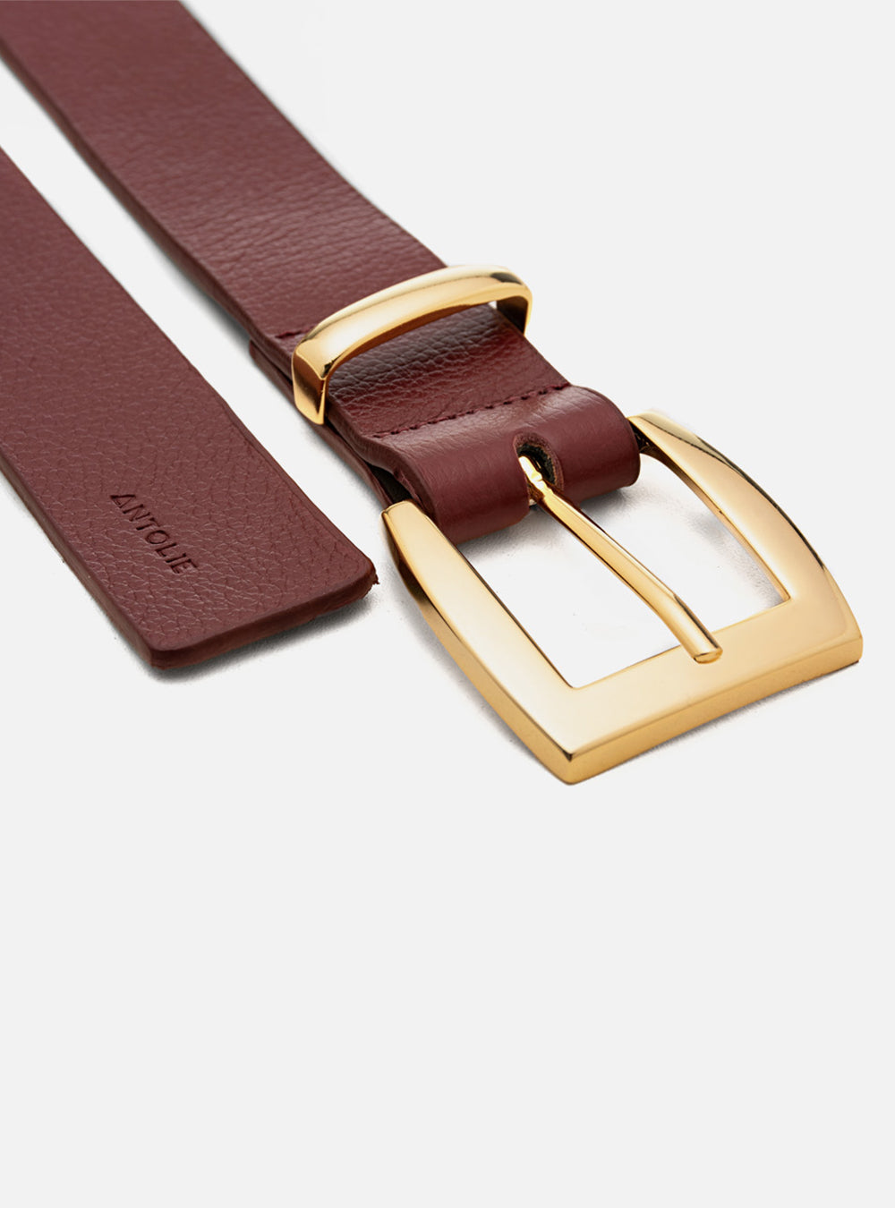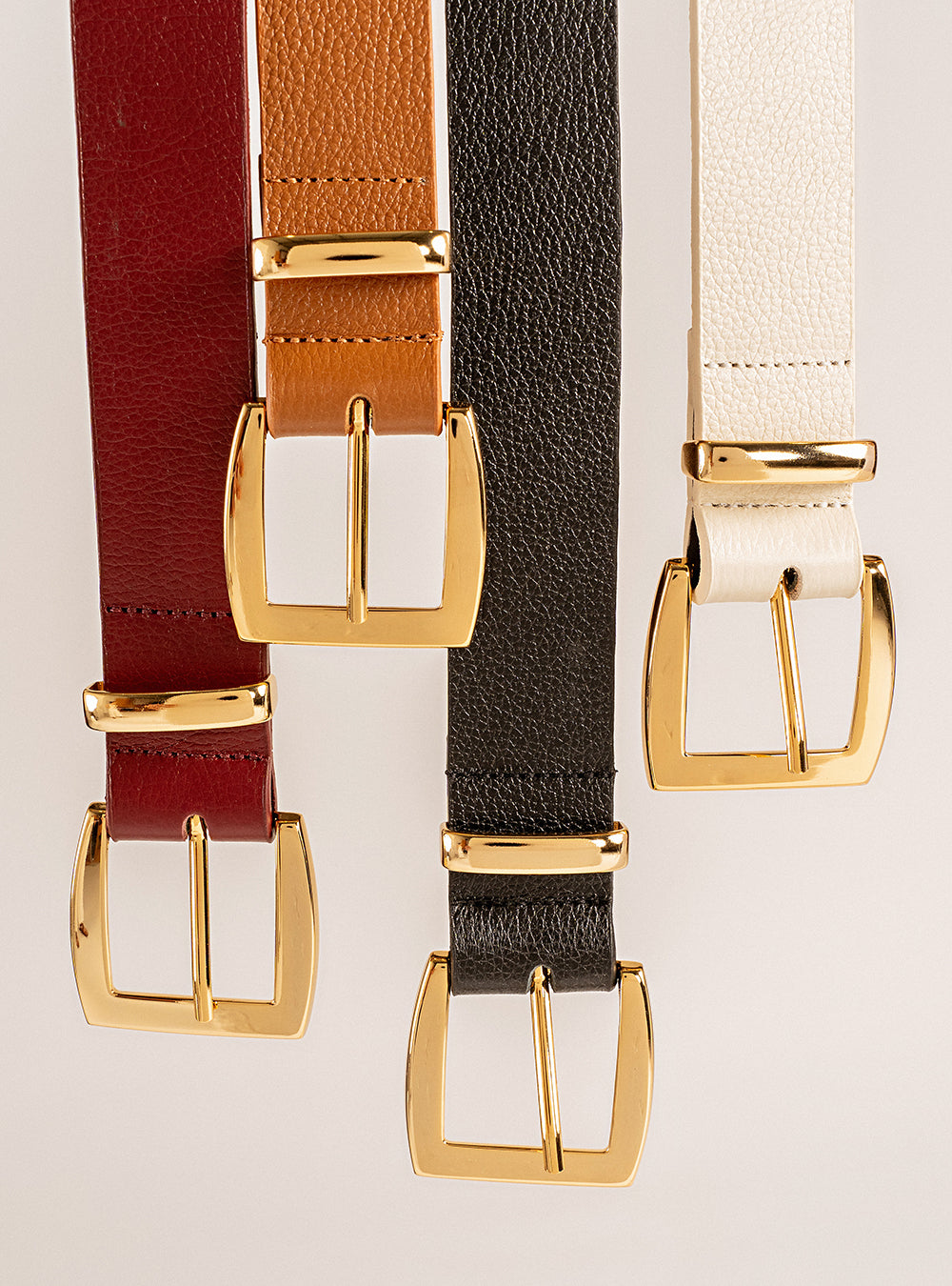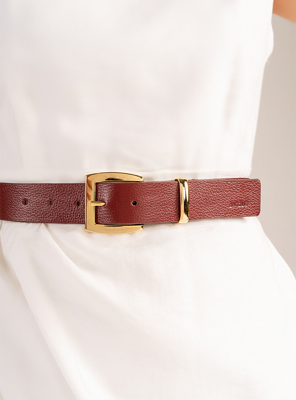 Em couro bordô, o modelo com fivela quadrada dourada é ideal para quem busca um acessório que se destaque no look. A cor transmite elegância com um toque fashion, enquanto o design geométrico da fivela garante personalidade extra à produção.