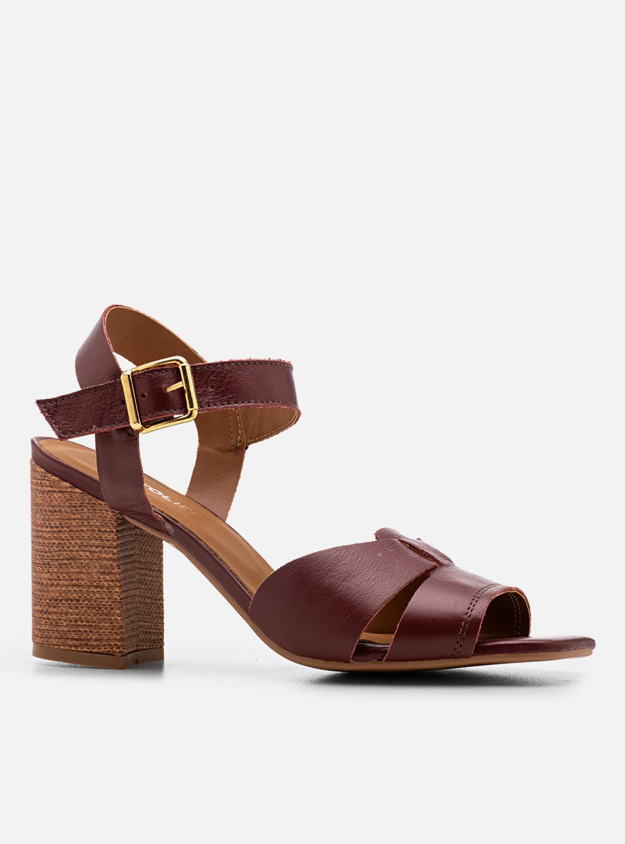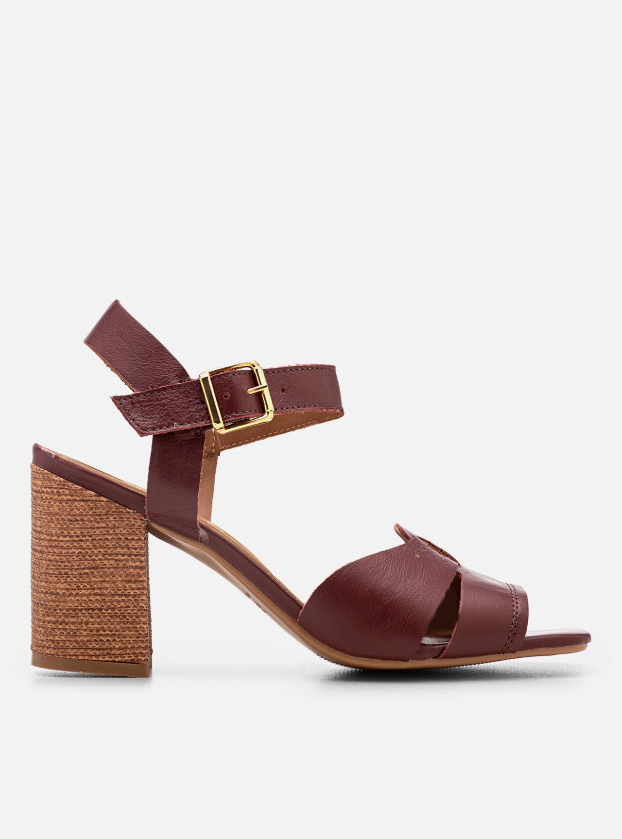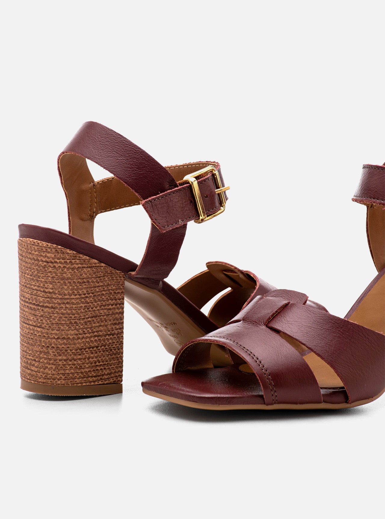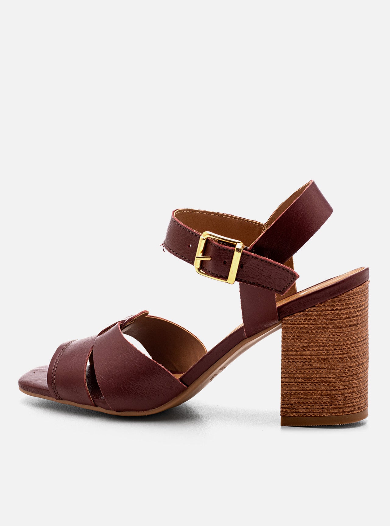O jogo de tiras em enlace cria profundidade visual e transforma o pé na pauta principal da composição. O bordô atua como assinatura cromática: clássico na essência, moderno na atitude.
