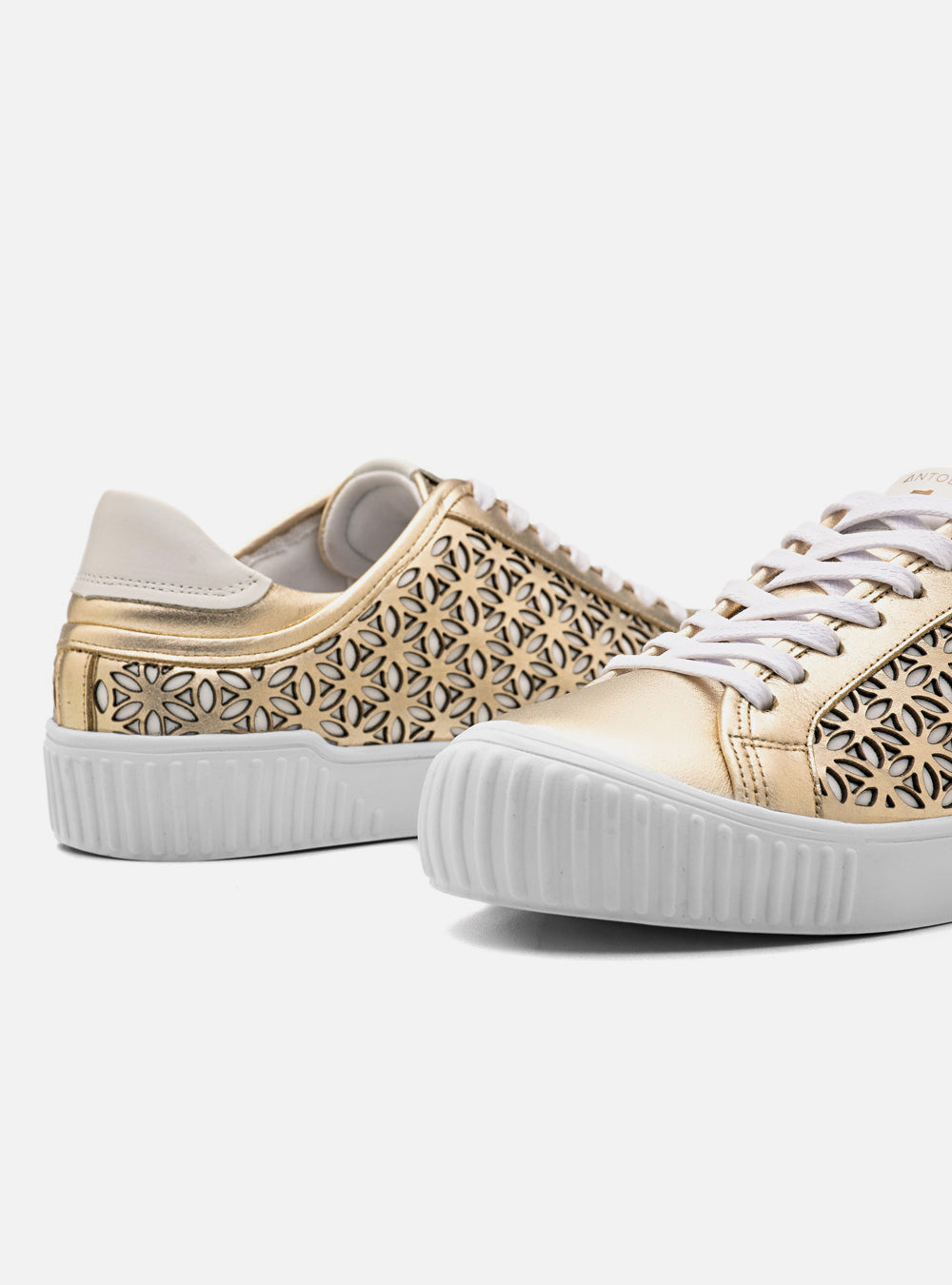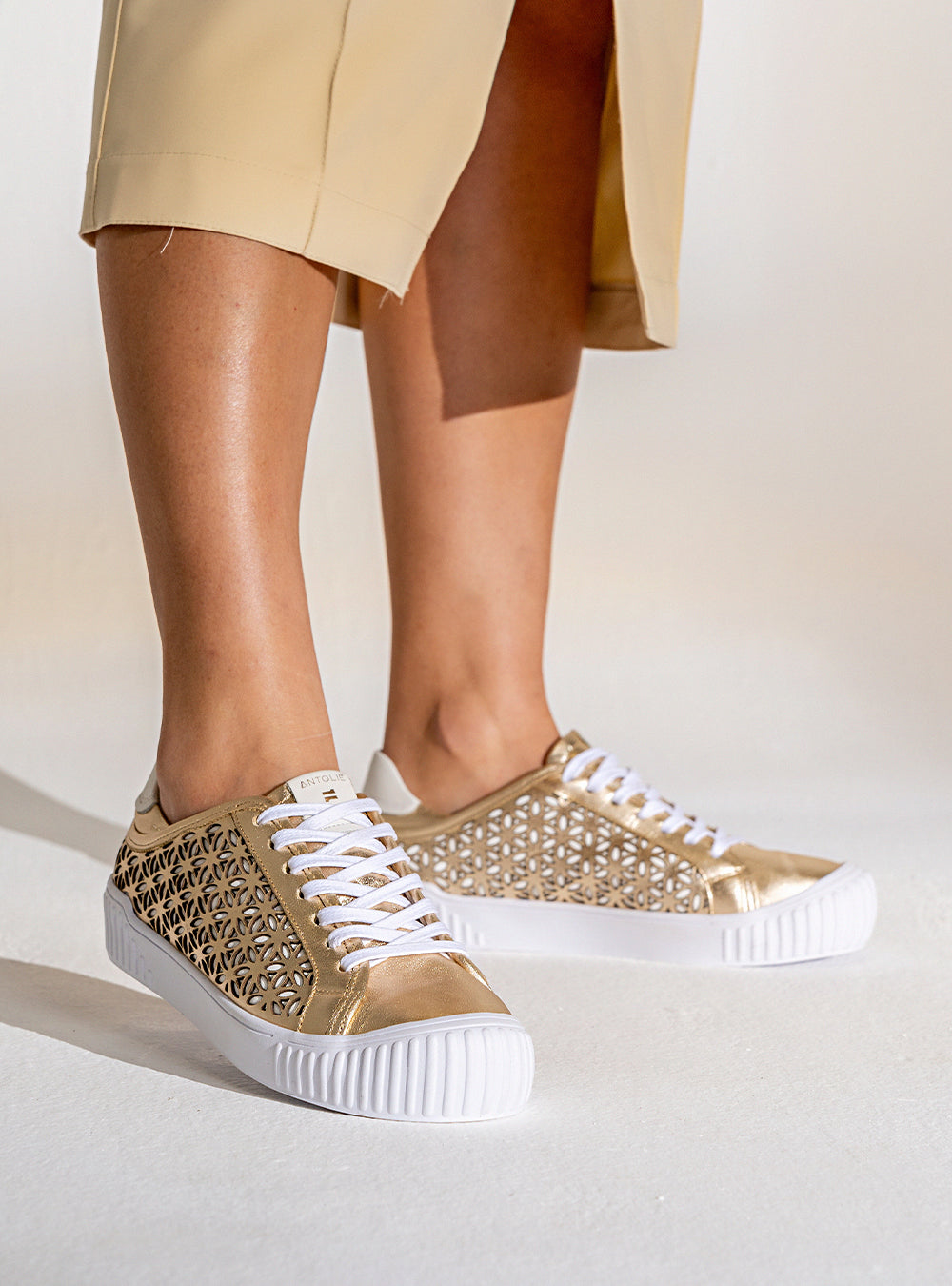 Para aqueles que desejam um toque de requinte e originalidade em seu estilo diário, o Tênis Couro Dourado Detalhe Laser é a escolha definitiva. Este calçado, meticulosamente confeccionado em couro legítimo de um sofisticado tom dourado, é a síntese perfeita entre glamour e inovação, com um design que certamente se destaca.