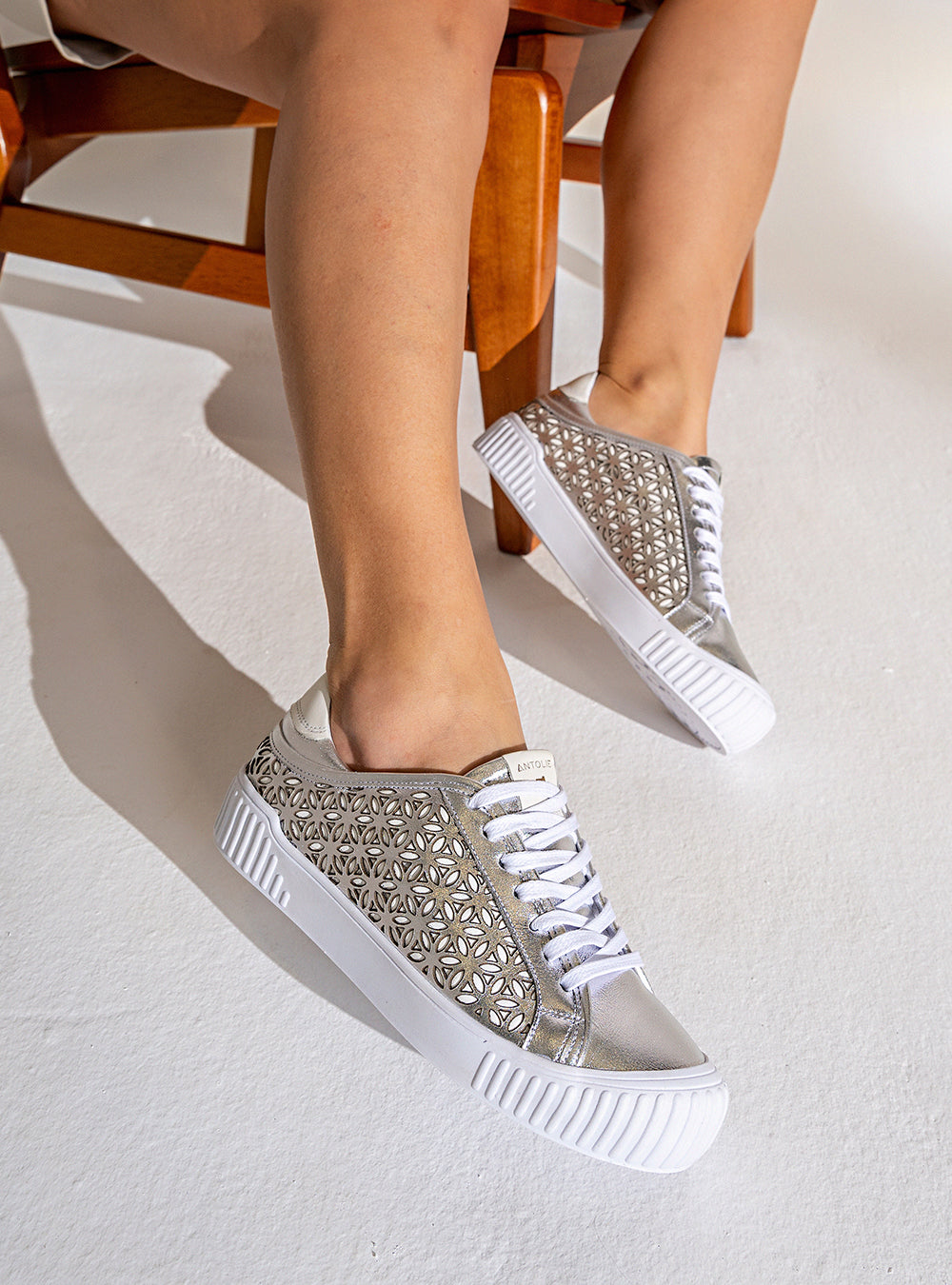 O verdadeiro charme do Tênis Couro Prata Detalhe Laser reside nos detalhes a laser. Com padrões delicados e esculpidos com precisão, esses detalhes não só embelezam o calçado, mas também conferem uma textura única que é ao mesmo tempo moderna e sofisticada. O contraste entre o brilho prateado e os intricados cortes a laser cria um visual fascinante que captura a atenção sem esforço.